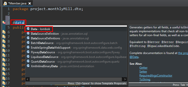 자바에서 자주 사용하는 Getter, Setter, 기본 생성자, toString 등을 일일이 생성해주지 않고, annotation을 통해 자동 생성해 준다. 나는 spingboot 에서의 환경에서 사용하는 방법을 보여줄 것이다.