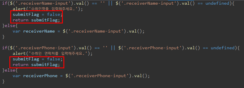 첫번째 조건문에서 보면 한조건에 만족했을 때 return submitFlag 를 만나서 함수가 끝나게 된다. 하지만 조건을 만족하지못해 else로 갔을 경우에는 함수가 종료되지 않게 해줘야한다 ( 뇌피셜, 아니라면 댓글로 남겨주세요).