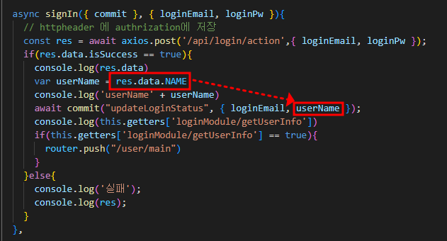 처음에는 userName 이라는 곳에 res.data.NAME을 아예 넣어서 실험을 해봤었다. 그런데, 안되더라. 그래서 음... 직접적으로 데이터를 넣으면 안되는건가? 라는 생각에 변수에 담아서 변수를 넣었다. 그랬더니 작동을 하더라.