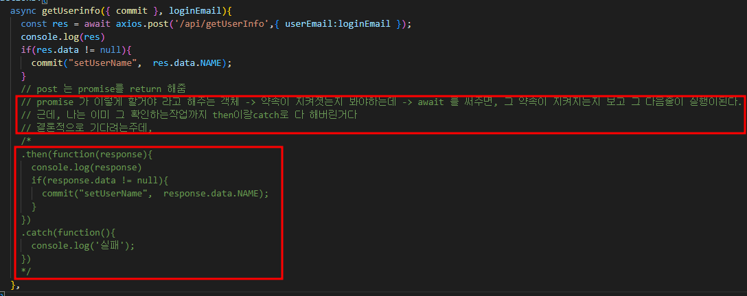 여기서 전부터 의문이 생겼던 부분은, 비동기적 특성상 코드가 짜여진 순서대로 진행이 되지 않기 때문에 이를 통제하기 위해, Promise 객체의 resolve/reject 를 사용할 것이냐? async/await을 사용할 것인가이다.